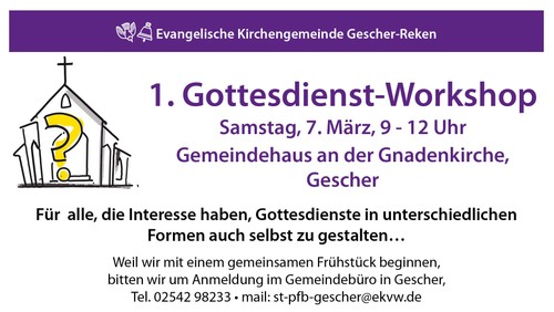 Zu einem ersten „Gottesdienst Workshop“ am Samstag, 7. März von 9 - 12 Uhr lädt die Ev. Kirchengemeinde Gescher-Reken herzlich in das Gemeindehaus an der Gnadenkirche in Gescher ein!