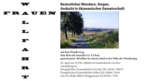 Zur Frauenwallfahrt lädt Heike Ebbert-Brüggemann, Prädikantin unserer Kirchengemeinde in die Hohe Mark ein. Gewandert wird der ca. 9,5 km lange Wanderweg "Dein Bett mit Aussicht" mit "besinnlichen" Pausen. Ein gemeinsamer Abschluss in einem Lokal in der Nähe der Wanderstrecke ist geplant. Die Fahrt wird in Fahrgemeinschaften stattfinden. Dazu treffen sich alle "Mitpilgerinnen" an der Ev. Gnadenkirche in Gescher. Zur besseren Planung wird um Anmeldung gebeten.