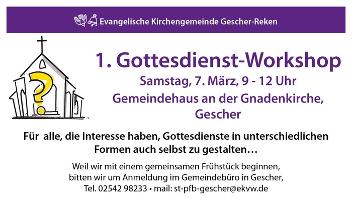 Zu einem ersten „Gottesdienst Workshop“ am Samstag, 7. März von 9 - 12 Uhr lädt die Ev. Kirchengemeinde Gescher-Reken herzlich in das Gemeindehaus an der Gnadenkirche in Gescher ein!